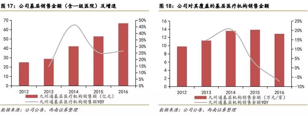 近年来公司的基层医疗机构的销售额亦呈上升趋势,2016年为67亿元(含税),同比增长26.5%。由于2016年的快速布局,单家基层医疗机构的销售金额略有下滑,但我们认为随着分级诊疗对基层终端的扩容及新开发机构的业务成熟,单个机构的销售额将提升。