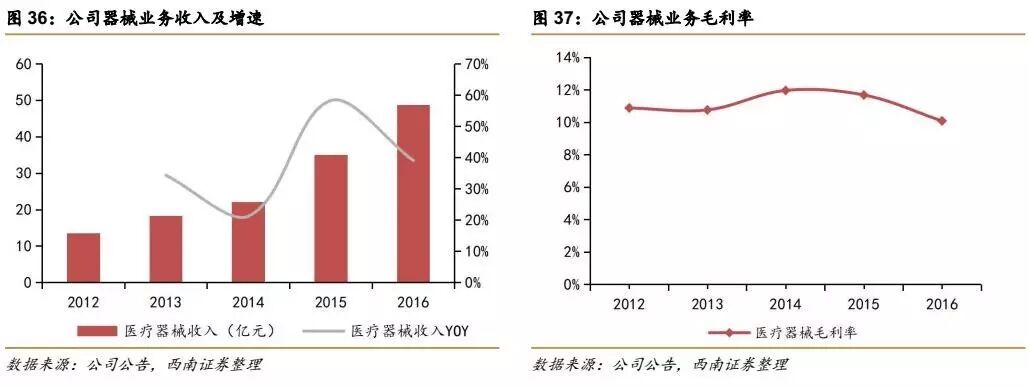 器械业务:公司一方面通过搭建器械的物流平台和医院转配送业务;另一方面,也在拓展高值耗材等专业领域的销售业务,开创新的业务模式与经营领域。公司于2015年对医疗器械经营管理进行创新,原集团医疗器械事业部改组为“九州通医疗器械集团有限公司”,下设17家区域公司医疗器械部也相应成立区域医疗器械公司,医疗器械板的业务独立性及对外合作能力大大增强。整合后公司的医疗器械业务加速成长,2015-2016年增速均保持在40%左右
