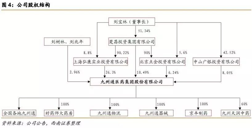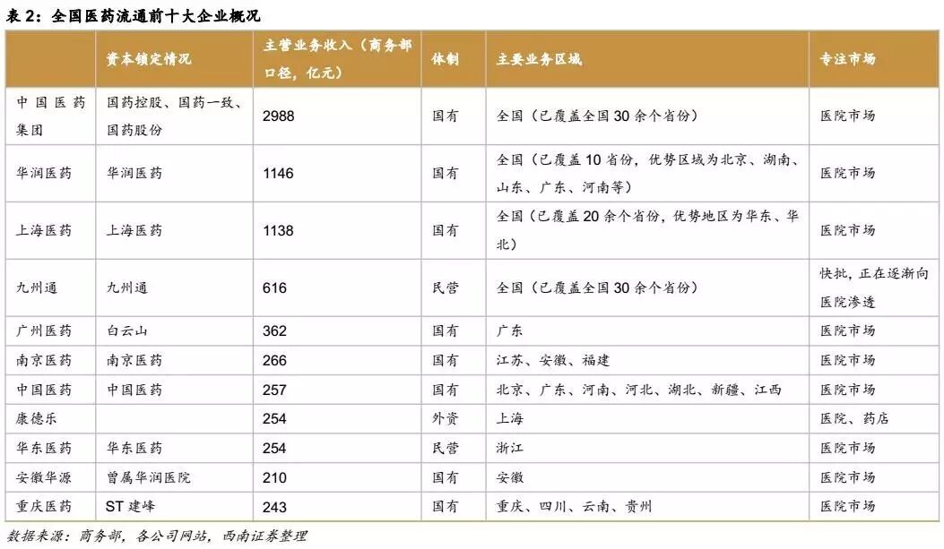 由于医药流通公司多为计划经济时代的医药配送站发展而来,目前,市场上大部分医药流通龙头均为国企背景。在全国收入规模排名前十的医药流通公司中,仅九州通和华东医药为民营企业,在已实现全国布局的四家公司中,九州通为唯一的民营企业。