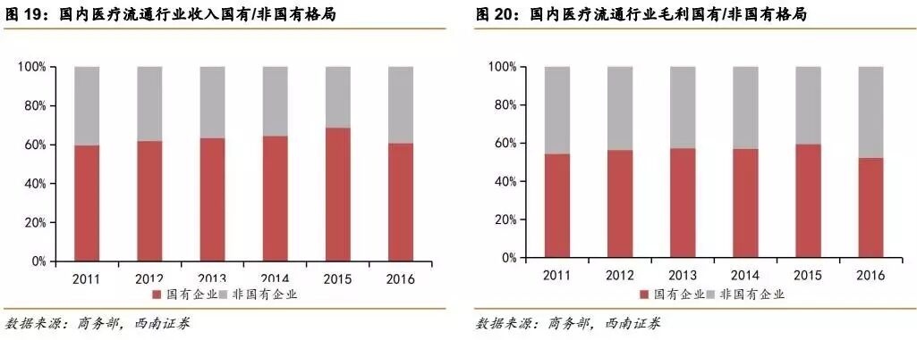 由于国有企业与医院具备历史业务粘性、资金实力雄厚,在医药流通市场中占据主导地位,2015年之前,国有企业在医药流通市场的市占率处于不断提升的趋势,2016年国有企业的市占率约52%,我们估计在医院市场中其市占率接近70%。九州通虽已覆盖全国,但业务领域主要集中在基层、药店终端的纯销及调拨。