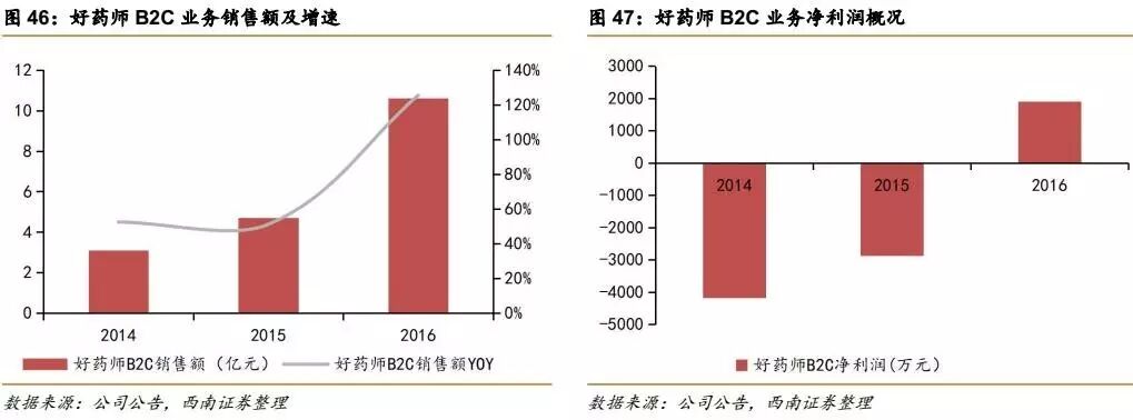 B2C业务:好药师网上药店。于2011年正式上线,提供线上药品购买,我们估计目前会员1200万人左右。2016年好药师基本可以实现武汉、北京、上海、郑州、福州、济南、南京、芜湖、昆山、新疆、杭州、广州、天津等13个城市核心区域“24小时送药、1小时必达”的O2O服务,并通过渠道拓展先后引进全国一线大流量三方平台,包括百度外卖、美团外卖、京东到家等,创立三方平台引流的销售模式,为线上业务搭建了稳定的流量入口。