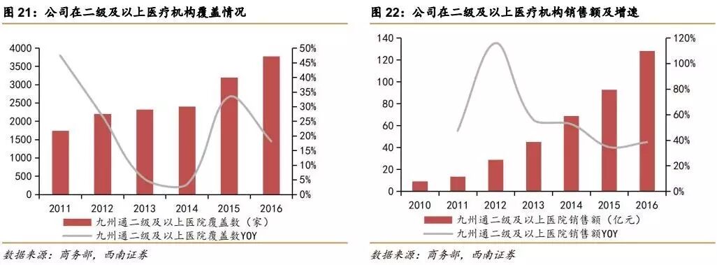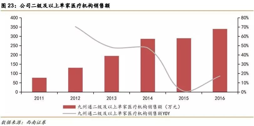 公司从2010年开始开拓中高端医院市场(即二级及以上医疗机构),2015年布局速度明显加快,近年来在二级以上医疗机构销售额增速维持在40%左右。