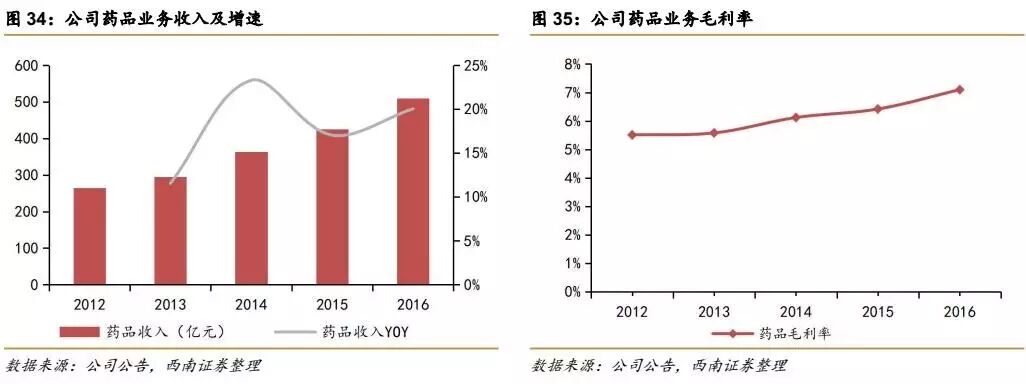 药品业务:近年来增速维持在20%左右,2016年呈现加速趋势,毛利率亦不断提升。我们认为主要原因在于加强医疗机构终端扩展、直接对终端的纯销比例提升所致。在行业集中度提升、终端变革加剧的背景下,我们认为未来该趋势还将继续延续。