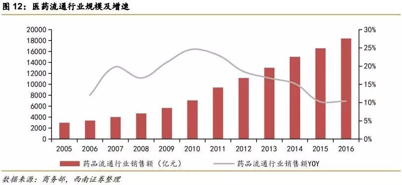 在医保控费的背景下,近年来医药流通市场的行业增速稳定在10%左右。但随着分级诊疗政策的推进,国内药品市场的终端格局体现出分化趋势。从南方所2016年的终端数据来看,医院终端的药品销售增速下降至8%左右,而基层终端药品增速提升至16%,二者的增速差距明显加大。