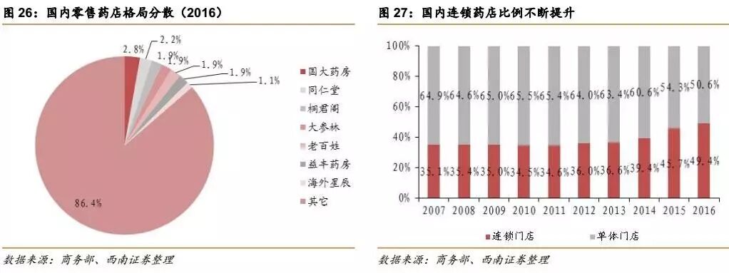 此外,下游零售行业集中度的提升亦将带来上游的集中化。在两票制及税收规范的背景下,单体药店的税收成本压力加大,连锁药店比例不断提升,.4%,同比提升约3.7个百分点,行业逐渐向规范运营的连锁药店集中。