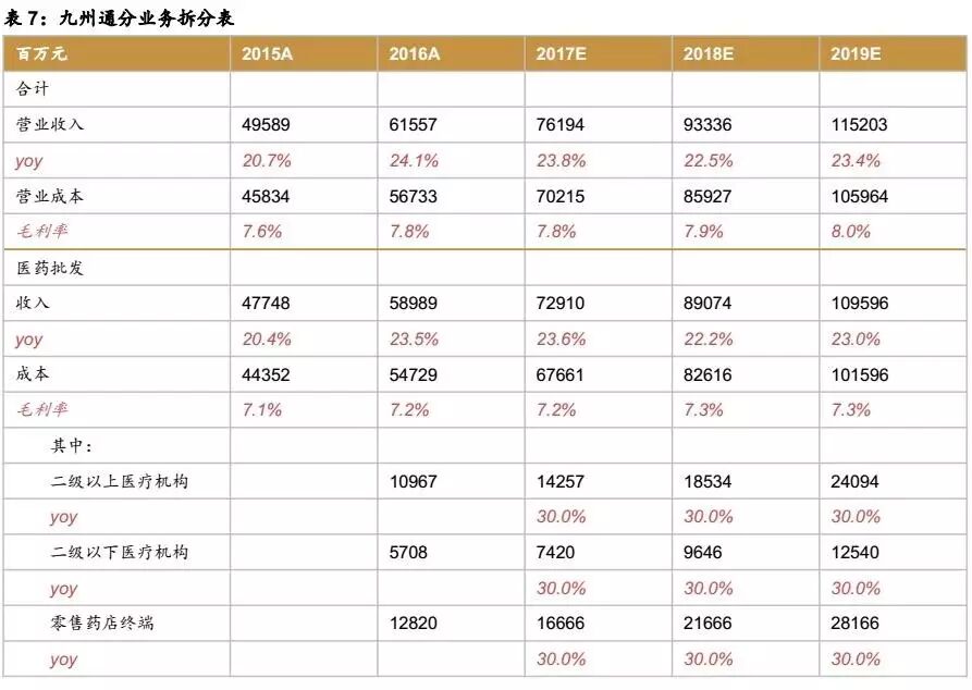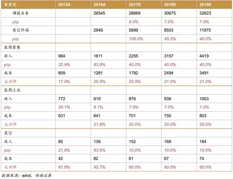由于零售市场、医疗器械及耗材市场尚未实施两票制,且大部分省份的基层医疗机构可允许“三票制”,我们认为公司的调拨业务还将继续存在,预计2019年调拨业务占收入的比重将收缩至30%左右,未来3年该终端的增速维持在10%左右。