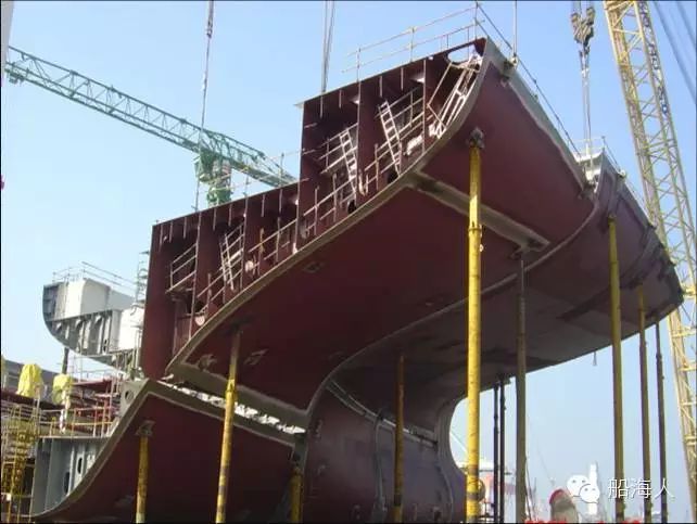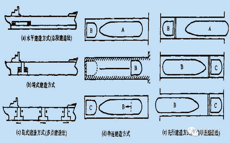 总段建造法:将预先装配焊接好的环形总段按照安装顺序进行船台装配。船厂在具有大型船坞、并有总组场地和起重能力予以保证情况下,采用总段建造法可以有效利用各主要生产资源。