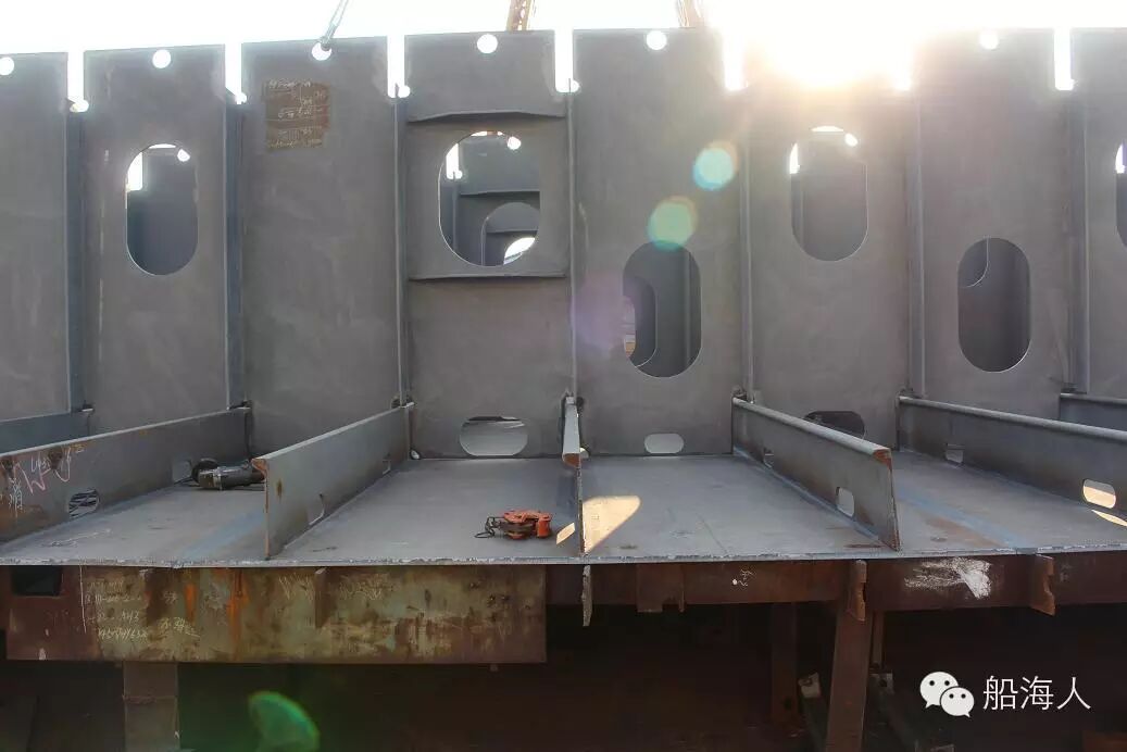 分段舾装:当分段倒置时在甲板顶面安装,分段翻身后在甲板表面安装。