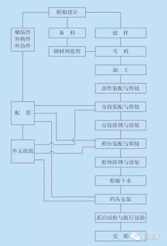钢材预处理——号料加工——零、部件装配——分段装焊——船台装焊(合拢)——拉线镗孔——船舶下水——发电机动车——主机动车——系泊试验——航海试验——完工交船