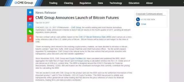 尽管确切的发布日期尚未公布,但CME表示,未来这一期货将通过现金结算,并基于其CME CF比特币参考汇率(CME CF Bitcoin Reference Rate,BRR)——该指数于2016年11月首次上线,并与总部位于伦敦的加密货币机构合作推出。该公司表示,全新比特币期货产品将在芝加哥商品交易所上市。