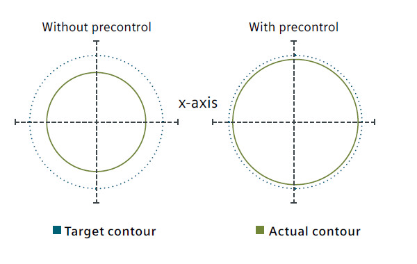 偏差指在机床轴运动时位置控制器与标准的偏差。轴偏差为机床轴的目标位置与其实际位置的差值。偏差导致与速度相关的不必要轮廓误差,尤其在轮廓曲率变化时,如圆形、方形轮廓等。凭借零件程序中的NC高级语言命令FFWON,在沿路径移动时,可以将与速度相关的偏差减为零。通过前馈控制提高路径精度,从而获得更好的加工效果。