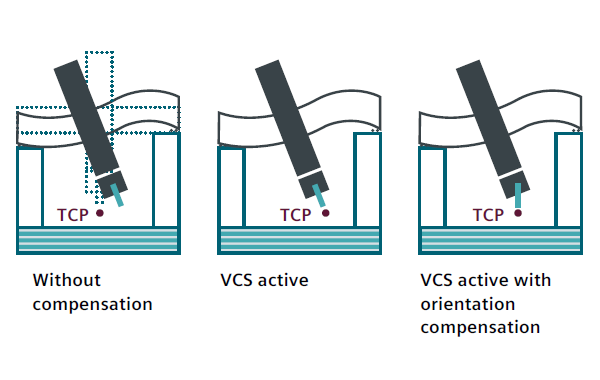 如果各机床单个部件的重量会导致活动部件位移和倾斜,则需要进行垂度补偿,因为它会导致相关机床部分(包括导向系统)下垂。角度误差补偿则用于当移动轴没有以正确的角度互相对齐时(例如,垂直)。随着零点位置的偏移不断增加,位置误差也增加。这两种误差均由机床的自重,或者刀具和工件重量所导致。在调试时测得的补偿值被定量后按照相应的位置以某种形式,如补偿表,存储在SINUMERIK中。在机床运行时,相关轴的位置根据存储点的补偿值进行插补。对于每次连续路径移动,均存在基本轴与补偿轴。