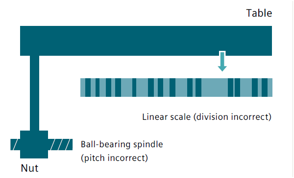 CNC控制系统中间接测量的测量原理基于这样一个假设:即滚珠丝杠的螺距在有效行程内保持不变,因此在理论上,可以根据驱动电机的运动信息位置推导出直线轴的实际位置。但是,滚珠丝杠的制造误差会导致测量系统产生偏差(又称丝杠螺距误差)。测量偏差(取决于所用测量系统)与测量系统在机床上的安装误差(又称为测量系统误差)可能进一步加剧此问题。为了补偿这两种误差,使可使用一套独立的测量系统(激光测量)测量CNC机床的自然误差曲线,然后,将所需补偿值保存在CNC系统中进行补偿。