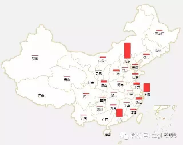 从地图上看,北京、上海、广东明显突出,其他地区相较而言都比较弱。