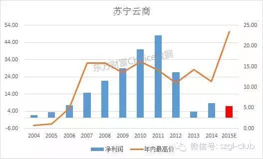 2011年之前,苏宁的业绩持续快速稳定增长,斜率非常漂亮,此后阿里、京东电子商务开始快速侵袭苏宁核心领域,苏宁电器经过几番折腾更名苏宁云商,民营银行、综合电商的概念开始火热,随着牛市深入助推苏宁市值再创新高。
