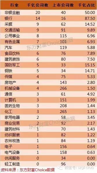 非银金融(20家)、银行(14家)金融巨头占据近三分之一的席位。采掘、交通运输、公用事业、有色金属、汽车、食品饮料、建筑装饰、国防军工、钢铁行业都有5个以上的千亿公司。传媒、房地产、机械设备行业有4家。通信、计算机、医药生物、化工行业各有3家。家用电器、商业贸易行业各有2家千亿市值公司。建筑材料、纺织服装、农林牧渔、电子、电气设备行业各有1家。休闲服务和轻工制造行业没有产生千亿市值公司。