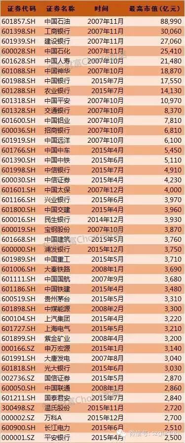 2001年8月8日,中国石化上市让A股市场有了第一家千亿市值公司;至2015年底,历史上一共产生了129家千亿市值的公司,其中9家公司的市值曾经超过万亿元,15家公司的市值曾经超过五千亿元。