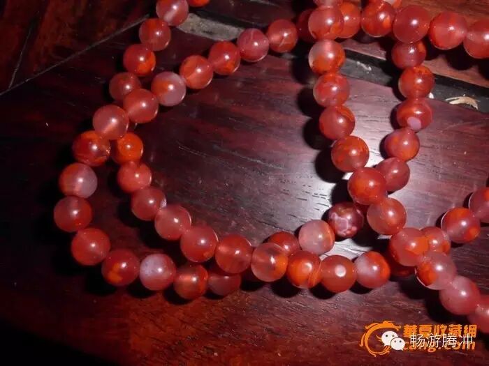 这是南红从西藏走入清廷之后出现的,属于内陆地区的产品(亦常见于云南)。一般都具有形制规整、圆形周正、抛光程度高、极少出现白芯的特点。比较容易和藏区的圆珠产生混淆。由于整个上层文化对藏文化的偏爱,所以就在清朝规制之外出现了南红的朝珠,在不敢使用南红朝珠的官员中,似乎也有使用南红的倾向,我们从一些历史遗物中可以看到一些南红材质的分珠(即朝珠串中那4颗大珠)、三通、背云、佛头、佛嘴、坠子等。一般这些南红配件都配合象牙、翡翠材质使用为较常见。十分罕见的南红雕花珠绝大多数都是属于朝珠范围的。清手串珠也同样属于此范围。