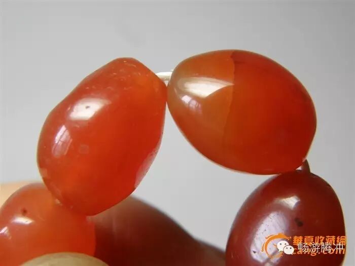 一种是相对规矩的扁珠,具有明显的橄榄型特征,珠体具有较好的对称性。这种珠子恐怕是最为常见的南红珠形制。这种珠子的断代基本可以认同17-18世纪的,但是最早出现时期应该稍微看早些。18世纪之后其实这类珠子也在大量流行,直至红色中国前这种珠子形制才告绝迹。