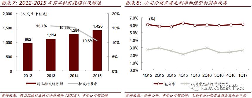 两票制推动行业集中度提升,龙头受益。两票制背景下,17年为整合关键年。公司目标是从现有分销网络覆盖的20个省扩展到28个(除了青海、西藏、新疆),云贵川、黑吉辽是第一轮的并购重点。16年三季度已在云南和黑龙江布局,17年一季度收购徐州医药、徐州淮海药业(两者收入规模约30亿),增持广州中山医(持股比例达82.59%)。我们预计:1、未来原有市场份额有望进一步提升,2、并购空白地区节奏有望加速。