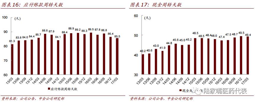 公司资产质量良好,资产负债结构稳定。从2016年和2017年一季度来看,公司存货周转天数、应收账款天数同比减少,资产周转加快。分销业务规模扩大和纯销比例加大会带来应收账款总量增加,但是公司优势地区华东地区医院回款速度快,我们认为应收账款风险可控。现金周期(~49天)处于合理水平。