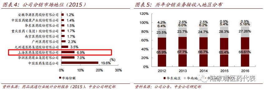 分销全国排名第三,华东地区为优势省份。,上海医药排名第三,市场份额约6.9%。截止2016年,分销业务华东地区收入占比66.6%,华北占27.3%,华南占5.2%。