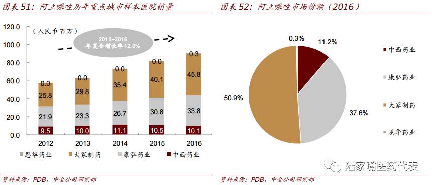 ► 竞争格局:在我国2016年样本医院销售额仅1.2亿,近5年CAGR为18.2%。共有3家生产企业,原研礼来专利已过期,市场份额不断下降,2016年市占率仍有71.9%。上海中西药业仿制药于2008年上市,目前市占率有23.9%。未来一致性评价后,进口替代空间较大。