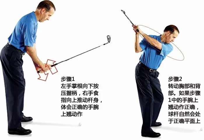 要想为挥杆开一个好头,你必须兼顾身体、手臂和双手动作。如果哪个部位动作过多,球杆就会高于或低于正确平面。要学习找到正确平面,可以握杆,将球杆置于身体前方,左手掌根向下按压握柄,右手食指向上推动杆身(见左图)。这就是找到正确平面所需的手腕上翘动作。现在,你只需使胸部和背部向着目标反方向转动,同时使左前臂沿顺时针方向转动(见上图)。在正确挥杆时争取找回训练法中的手腕动作和转肩动作。如果你的这些动作正确,你的触球质量和击球准确性都会大大提高。