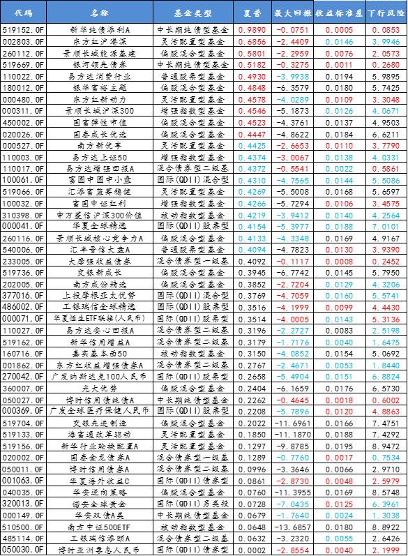 对于“最大回撤”、“收益标准差”和“下行风险”,将偏股基金或偏债基金或QDII型基金的前五名标红色,将偏股基金或偏债基金或QDII型基金的第6—10名标蓝色,排名越靠前,代表该基金的风险越低。对于夏普比率,将全部基金的前10名标红色,将全部基金的第11—20名标蓝色。根据下图数据得出: