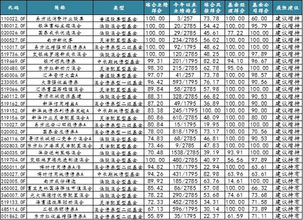 4.    特殊情况有:南方成分精选的基金经理由于上任不满2两年,基金经理得分很低,但其借助公司优秀的投研能力使得该基金获利能力和风控能力均优于同类绝大部分基金。东方红收益增强债券A成立较晚(2015年11月),因此对综合业绩和综合风控方面有所拖累,另外,东方红资管的股基表现优于债基表现,因此在债基中,其基金公司得分不是很高。