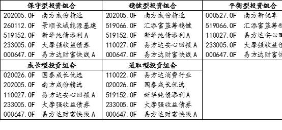 针对五个不同风险等级的投资者(保守型、稳健型、平衡型、成长型、进取型),今年年中,展恒基金研究中心从历月“优选50”优质基金池中再次精选基金,组成五个不同风险等级的公募基金组合(FOF),列表如下: