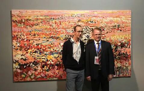 艺术家乌韦·科斯基(左)在其作品《森林》前与德意志联邦共和国驻华公使雷宇翰先生(右)合影。中国青年报·中青在线记者 程璨/摄