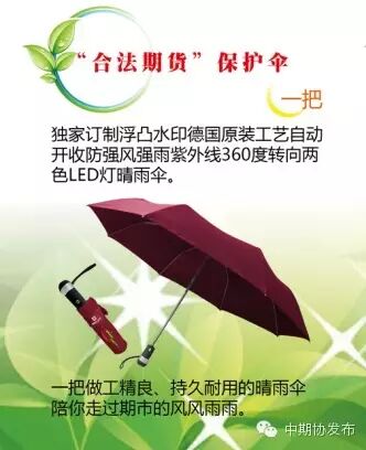 活动测试尝鲜期奖品为“独家定制德国工艺带LED灯晴雨伞”,测试从本周二开始。题目来源为中国证监会和中国期货业协会近期发布的一些法规及自律规则如《期货公司监督管理办法》、资管业务和风险管理公司业务的自律规则,以及其它相关内容。测试期间中奖率翻倍,欢迎大家参与!