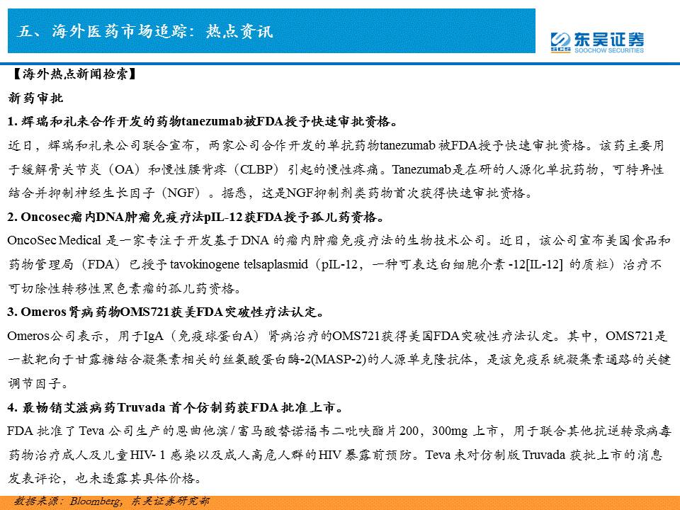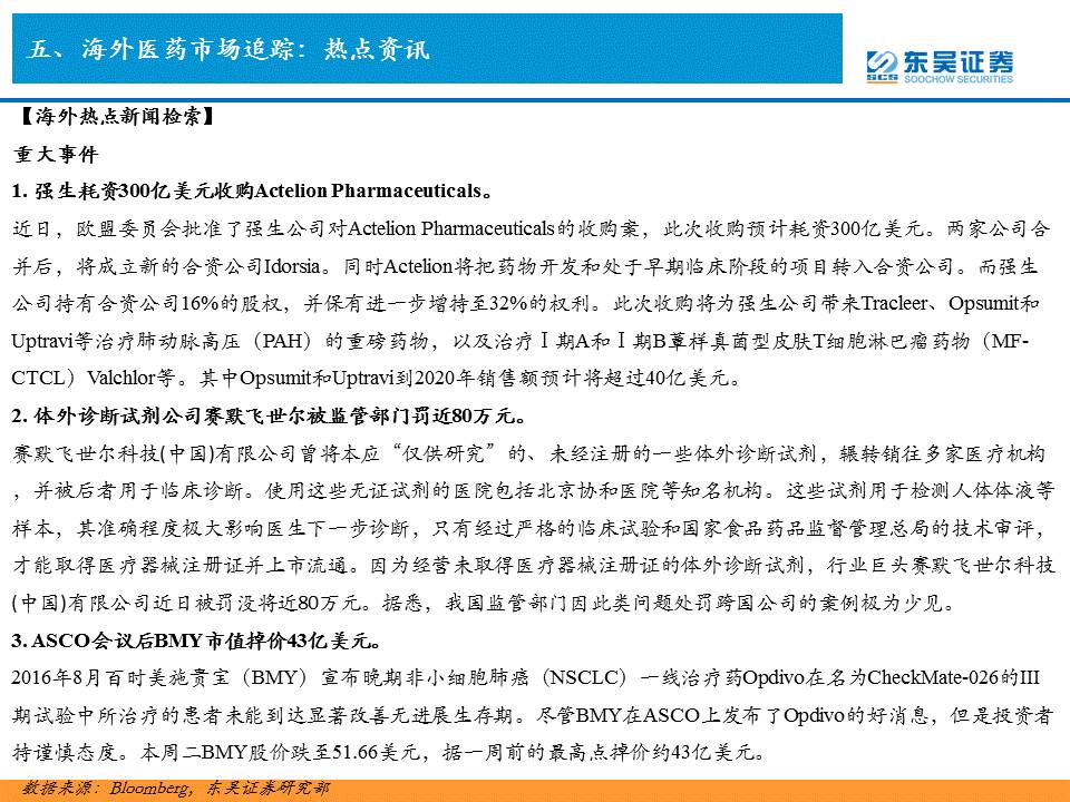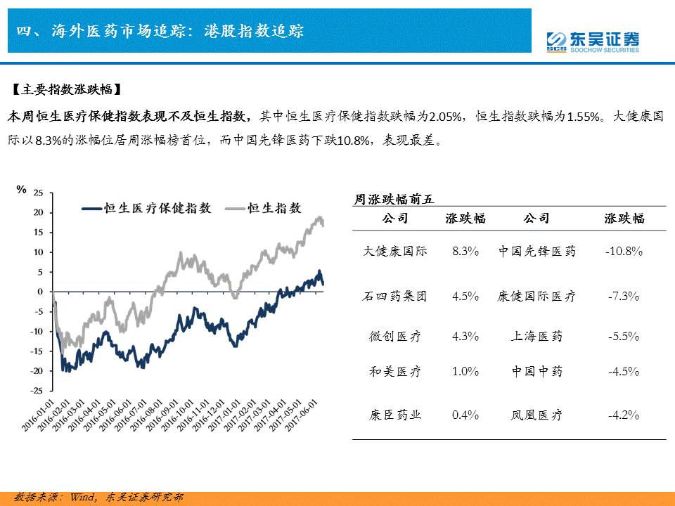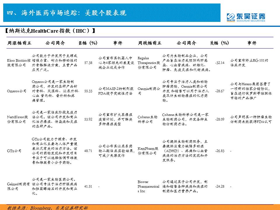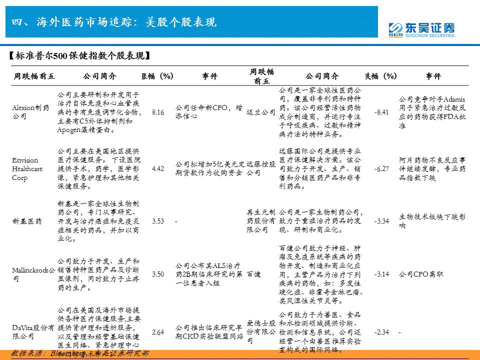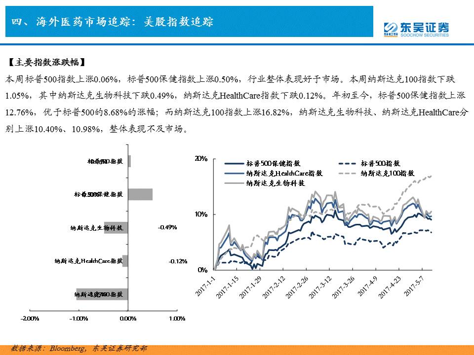本周美股指数出现分化,标普指数上扬而纳斯达克指数大幅下跌,医药板块表现均优于所在市场。其中,标普500保健指数上涨0.50%,优于标普500指数的0.06%的涨幅;本周纳斯达克100指数下跌1.05%,而纳斯达克生物科技、纳斯达克HealthCare指数分别仅下跌0.49%、0.12%。