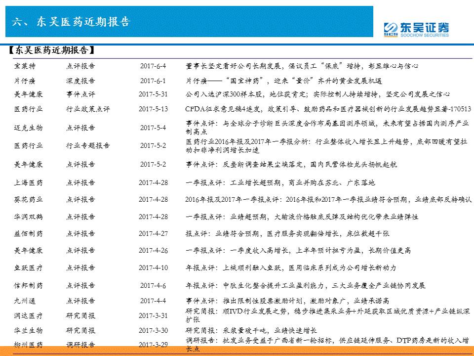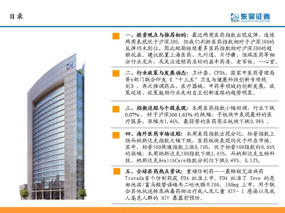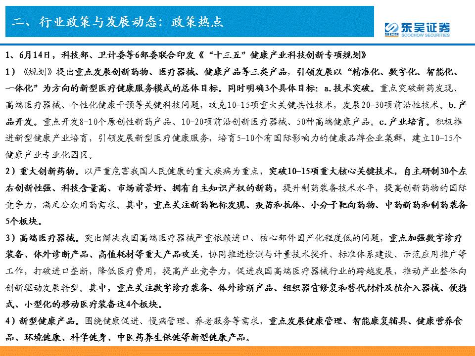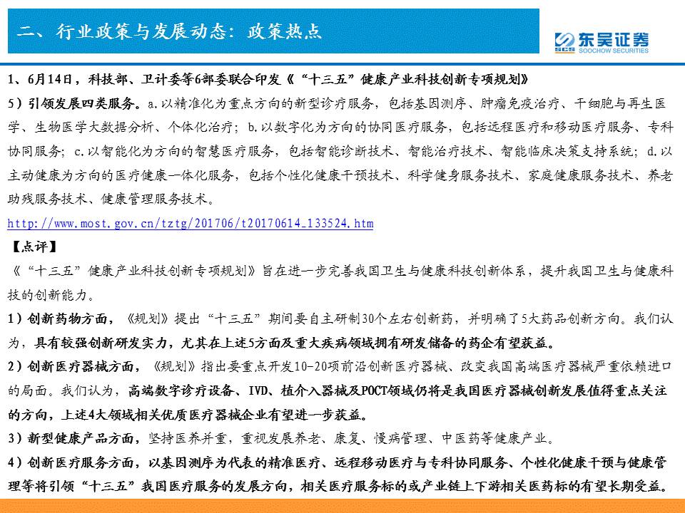 卫计委、CFDA、国家中医药管理局等6部门联合印发《“十三五”卫生与健康科技创新专项规划》,再次强调药品、医疗器械、中药等领域的创新发展,政策延续、政策鼓励行业走向自主创新道路的趋势明显。
