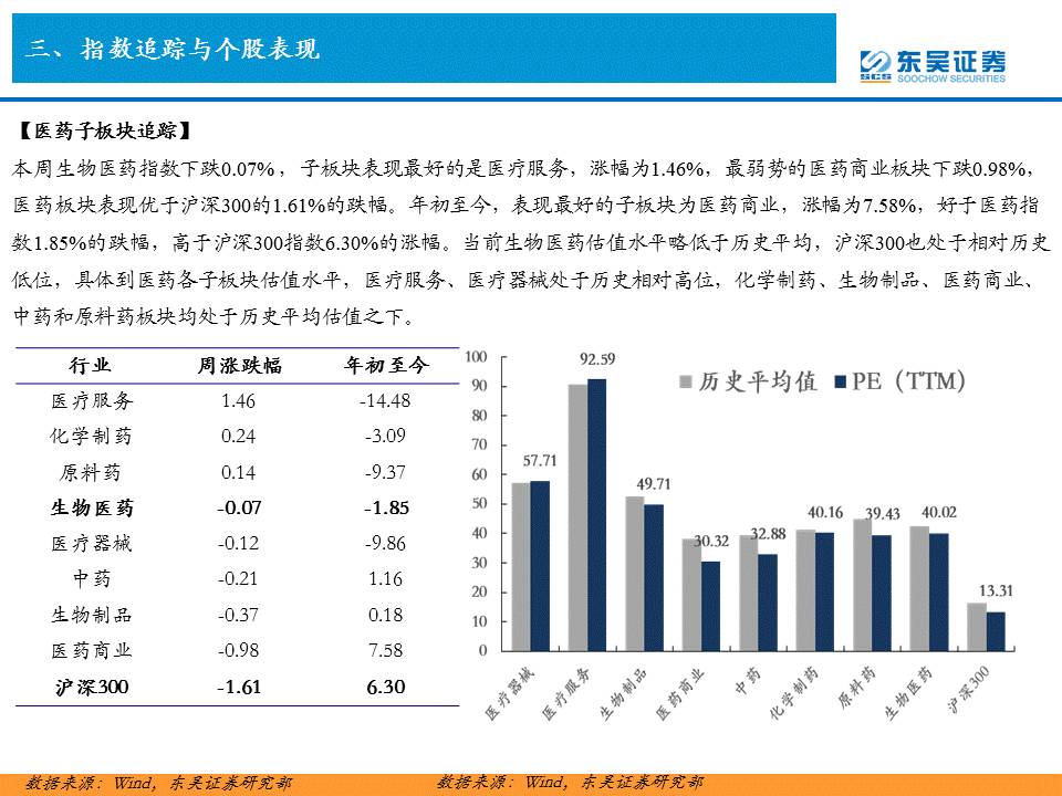 本周医药指数小幅回调,行业下跌0.07%,好于沪深3001.61%的跌幅;子板块中表现最好的医疗服务,涨幅为1.46%,最弱势的医药商业板块下跌0.98%。