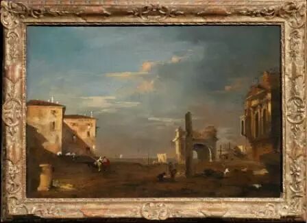 弗朗西斯科•瓜尔迪(Francesco Guardi 1712-1793年),威尼斯画家,以擅长威尼斯城市风景画知名,他还创作海景画、人物素描画、肖像画和废墟风景画等。他是游离于卡纳莱托(Canaletto)城市风景画流派之外的人物,而他对变化中的光线和颜色的闪烁点,较之后者亦要敏感得多。他常用活波灵巧的笔法描绘威尼斯生活的画景。他是装饰画家多明尼哥(Domenico)的儿子, 生于威尼斯,先是师从胞兄乔瓦尼•安东尼奥(Giovanni Antonio),后者是洛可可式祭台装饰屏画家。不久以后,他成为画家卡纳莱托(Canaletto)的助手,并接触到画家提也波洛(Tiepolo)的作品,后者是他的姐夫。但他真正受到的影响,却来自画家隆吉(Longhi)、利契(Ricci)和马尼亚斯科(Magnasco),并传承了马尼亚斯科风格的衣钵,其大部分作品多作于1760年以后。
