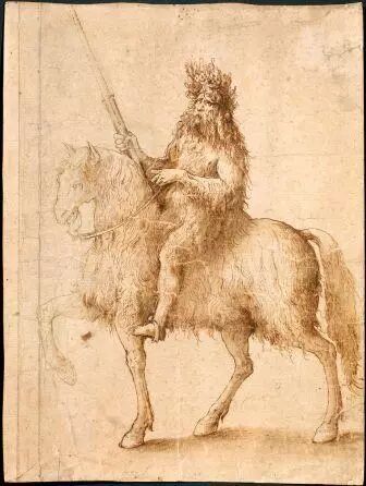 当米开朗基罗以大卫雕像(1501-1504)展现人的完美和新生时,丢勒以同样高超的技法创作了蚀版画《圣尤斯塔斯》(1501),将这位殉教者与神迹相遇的景象表现的如人间乐园。不过,他在那个时期的代表作则是稍早一点创作的《启示录》木刻组画,其在内容和表现风格上更明显带有哥特式教诲性小型画像的特征。