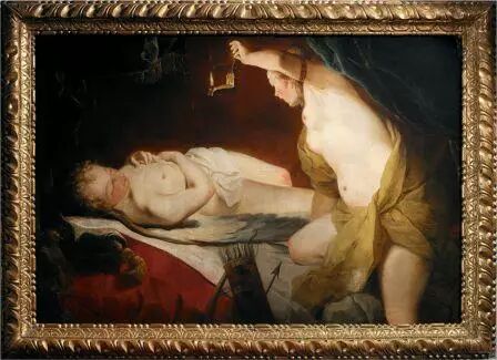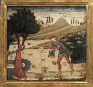 这幅画创作于十五世纪,作者题名“巴黎画师”。画中的主题“阿波罗与达芙妮”来自古希腊罗马神话传说。传说中太阳之神阿波罗因为相貌英俊又擅音乐而备受神界和凡间的女子喜爱。一次,由于不慎得罪了小爱神丘比特,丘比特便恶作剧用金箭射中了阿波罗,被金箭射中的阿波罗立即爱上了第一眼看到的精灵达芙妮,可达芙妮被丘比特射中了铅箭,因此而拒绝阿波罗的炽热追求,并求助她的父亲河神佩内奥,佩内奥不忍看女儿痛苦不堪便将其化做一棵桂树,画中的达芙妮正在向桂树转化,阿波罗情急之下欲上前阻止却为时已晚。贵为太阳之神、音乐之神、医药之神的阿波罗竟然无回天之力挽救自己心爱女子的生命,此后,他就用桂树的枝叶做成头冠勉励在竞技中获胜的人,因为,桂树在他心目中是至高无上的象征。