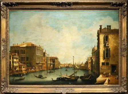 贝尔纳多•贝洛托(Bernardo Bellotto),又名卡纳莱托(1720-1780年),威尼斯风景画家,是著名的安东尼奥•克纳雷(别名卡纳莱托)的侄子和弟子,并由此称为“卡纳莱托”。1747年以后,他到了德累斯顿,在那里,他为波兰国王奥古斯特三世和萨克森选帝侯绘制了一些德累斯顿风景画。七年战争爆发时,他前往维也纳,于1759 -1760年,为玛利亚•特雷莎女皇和列支敦士登公国亲王绘画。后来,他回到奥古斯特三世宫廷,先是在华沙,1762年又在德累斯顿绘画。1766-1767年,他在俄罗斯宫廷居留了一段时间,后又返回波兰,成为斯坦尼斯拉•奥古斯特(Stanislao Augusto)的宫廷画家。晚年的贝洛托不仅绘制了建筑风景画,还绘制了宗教和历史主题画以及骑士画像等。他的特长主要是城市风景画,这幅画正是描绘威尼斯大运河的风景,贡多拉在运河中穿行,运河两岸的建筑物立在水中,我们可以从中领略享誉世界的水城风采。