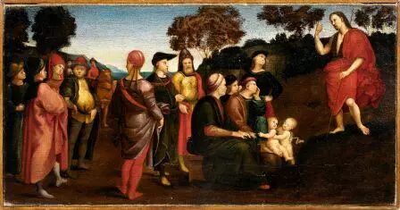 这幅画是伟大的艺术大师拉斐尔.桑齐奥(Raffaello Sanzio)创作于十六世纪初的木板油画。拉斐尔 (1483—1520年)生于意大利山区的乌尔宾诺小公园,父亲乔万尼·桑蒂是乌尔宾诺大公的御用画家,拉斐尔的启蒙教师。16岁时拉斐尔离开家乡乌尔宾诺到北意大利安布利亚地区的裴路基亚城,从师于佩鲁基诺。一天,佩鲁基诺对拉斐尔说:“我不想让这小地方拖住你,你要到大师云集的佛罗伦萨去,你可以独立工作了。”这时拉斐尔19岁。在佩鲁基诺的引导下,拉斐尔跨进了佛罗伦萨的艺术世界,他以一个学生的姿态对待达芬奇和米开朗基罗。教皇朱理二世为了赞颂自己,把最优秀的画家、雕刻家、建筑家都请到罗马来为他服务,米开朗基罗和刚满25岁的拉斐尔,被教皇认为是当时最杰出的两位大师。拉斐尔在《巴蒂斯塔布道》这部作品中以他的天资和严谨、柔雅的演绎技巧,描绘了圣乔瓦尼.巴蒂斯塔(San Giovanni Battista)的布道场景,画面中用小手抓着妇女深绿色衣裙的两名儿童格外引人注意。