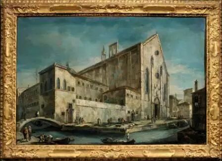 斯托蒙(Stoom), 威尼斯画家,18世纪上半叶生活在威尼斯并进行创作。这幅画的主题描绘了一个宏伟、古老的教堂——圣母玛利亚众仆(Santa Maria dei Servi)教堂,这个教堂当时已毁于火灾,不复存在。实际上,画家斯托蒙创作此画的启示得自多明尼哥•罗维萨编辑的一幅无名氏版画。