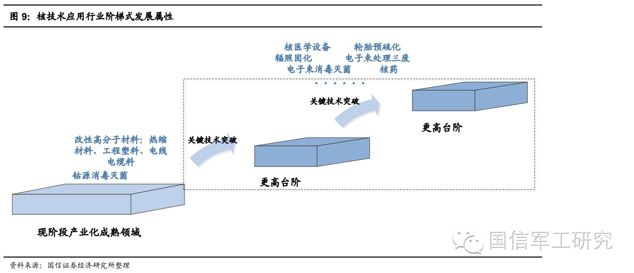 与其他行业的高度融合性和我国核技术应用产业发展初期阶段的特点决定了核技术应用产业的发展属性是阶梯式的。目前,核技术应用市场正处于产业化应用初期,只有高分子材料和钴源辐射杀菌产业化较成熟,其他核技术应用纵深领域还介于技术验证和产业化探索过程之间,未来随着以对应加速器为核心的关键技术的突破,包括核医学、轮胎预硫化、辐照固化等任一领域的产业化成熟,核技术应用行业将有望实现平台式提升。