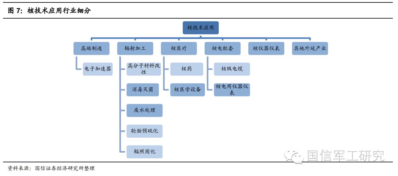核技术应用行业核技术应用行业涉及广泛,各细分行业间互有交叉。具体可细分为:1)高端制造业:包括应用于辐照加工、安检、肿瘤治疗等各领域的各类加速器; 2)辐射加工:高分子材料改性、消毒灭菌、环境保护、轮胎预硫化等;3)核医疗:包括核药、核医学装备等;4) 核电配套、核仪器仪表及其他外延产业。