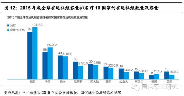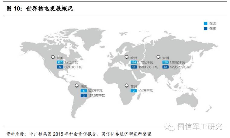据 IAEA 统计,截至2015年12月31日,全球共有440台在运核电机组(不含中国实验快堆),总装机容量为4.04亿千瓦。截至 2016年2 月底,我国(大陆)在运机组30台,装机2856万千瓦。在建机组24台,装机 2715.5万千瓦。我国在运机组数量全球排名第5,但我国在建机组数量及容量均排名世界第一。核电发展体现国家意志,属于高端装备朝阳行业,中广核集团作为在建与在运的核电规模均居全国第一的央企最为受益。