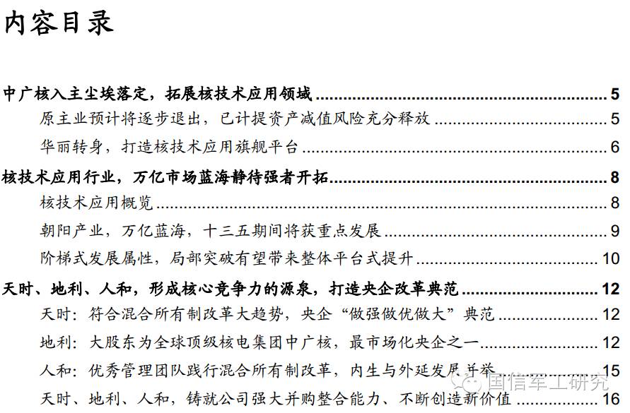 中广核首家A股上市公司,将继续利用资本市场做大做强。中广核核技术公司资本运作经验丰富,公司近年快速成长的一个重要手段是通过股权并购实现行业整合,将央企的资源优势与民企的市场化活力结合形成互补发展壮大。我们认为,在重大资产重组完成后,中广核核技术公司将充分利用上市公司平台,寻找广阔的核技术应用相关领域龙头企业的投资机会,并积极布局国际市场,推动我国核技术应用产业的进一步整合和升级。