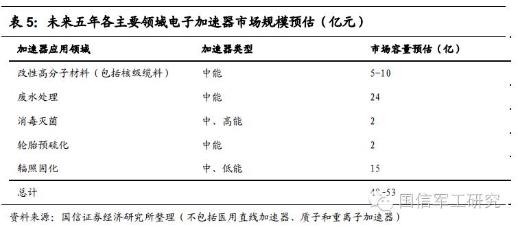 作为辐射加工产业的基础设备,非动力核技术应用的核心一环,电子加速器未来五年各领域市场之和将达50亿。材料改性、轮胎预硫化、辐照固化、三废处理、灭菌杀毒等辐照加工都属于加速器的下游应用领域。核技术应用的不断向前发展必然会推动电子辐射加速器的不断创新;同时,电子加速器的技术完善、产品创新也会不断驱动核技术应用的向前发展。各领域电子加速器市场规模预估如下: