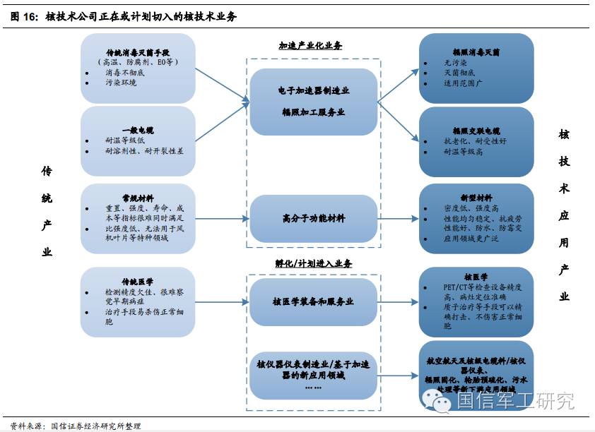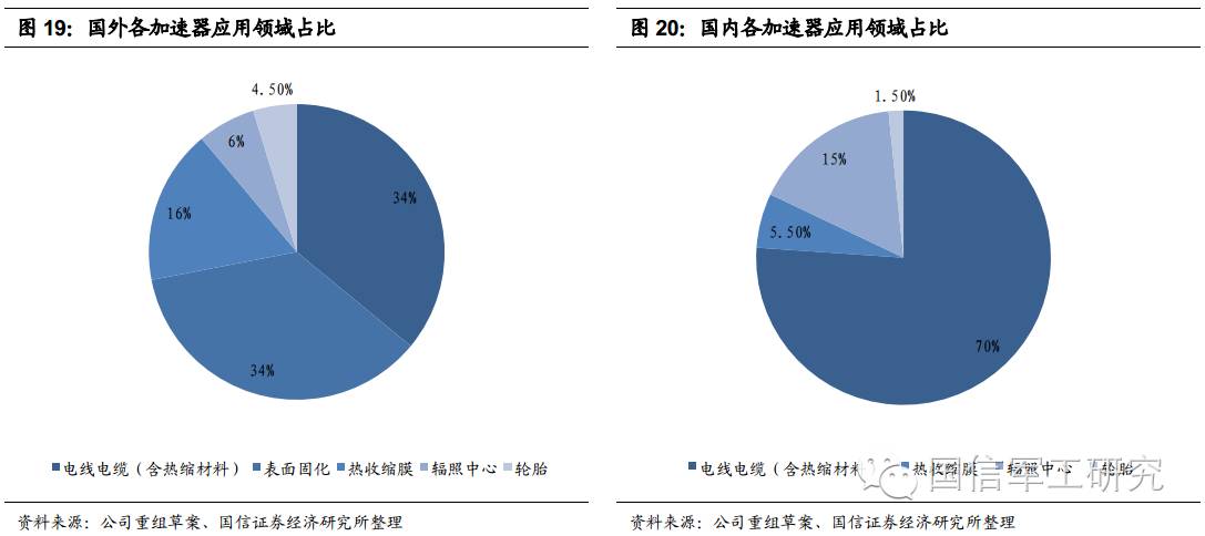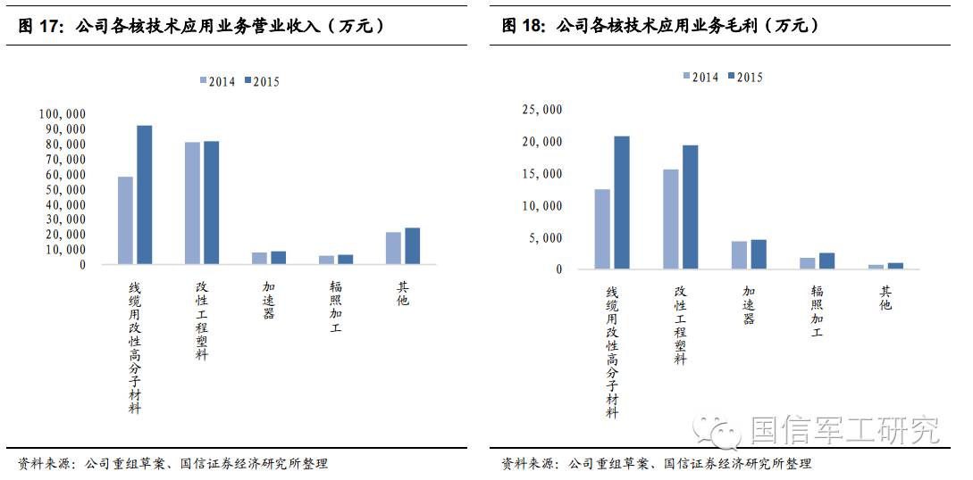 重组完成后,公司主业将聚焦改性高分子材料、加速器制造、辐照加工三个方向,并拓展核医学、核仪器仪表等具有更宽阔市场空间的非动力核技术应用领域性新方向。材料改性领域(包括线缆料和工程塑料)是目前国内核技术应用产业化最成熟领域,也是公司最主要的收入来源和利润基础;加速器是公司的核心技术和产业升级的关键驱动力;核医学将是未来公司重点突破业务;核仪器仪表是核电配套及核技术应用相关业务;辐照固化、轮胎预硫化、消毒等是加速器的下游应用领域,涉及范围广阔,局部突破或将带动公司业绩阶梯式增长。