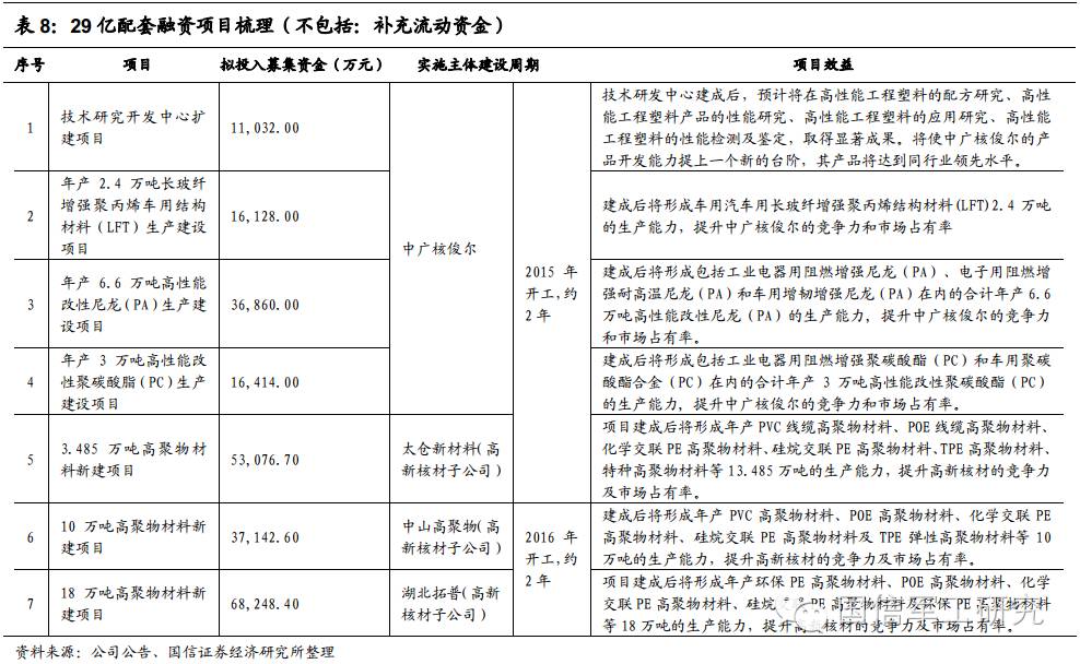 高分子材料业务是公司的主要收入来源和业绩基础,28亿定增继续加码。此次并入的七家标的公司中有五家主业为高分子材料相关业务。核技术公司作为核技术行业龙头企业,更加侧重的是中高端材料业务,以材料改性为核心竞争力,以用户导向和定制化为特点,覆盖核电、军工等领域,毛利高。同时,高分子材料业务也是公司发展至今外延并购、资本运作的重点,本次28亿定增方案中的全部7个项目都与高分子材料业务直接相关,表明公司在该领域继续做大做强的决心,募投项目达产后,上市公司业绩将会有一个质的提升。