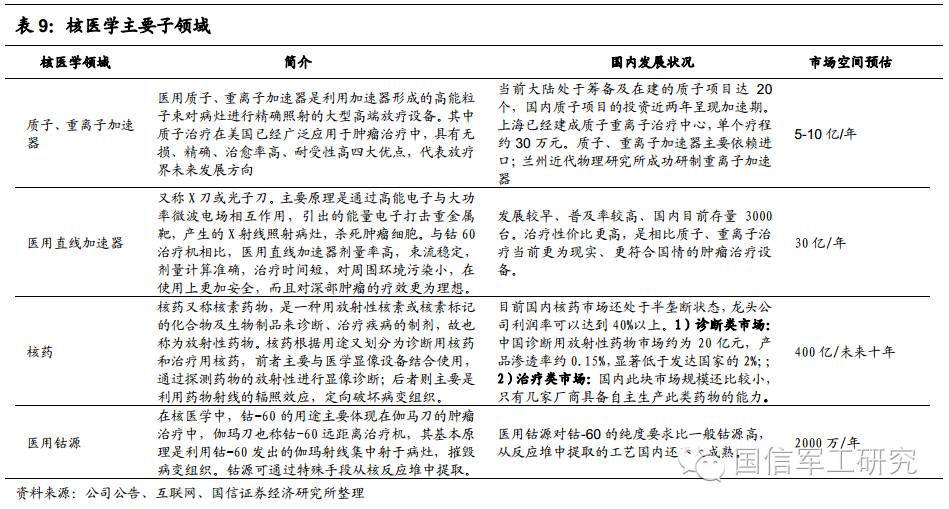 核医学设备与核药体现尖端科技,肿瘤放疗是重点方向。核医学是采用核技术来诊断、治疗和研究疾病的一门新兴学科。它是核技术、电子技术、计算机技术、化学、物理和生物学等现代科学技术与医学相结合的产物。根据Frost & Sullivan的预测,2020年美国核医学各领域市场规模总和将达到260亿美元,而国内核医学领域还处于发展初期,市场潜力很大。